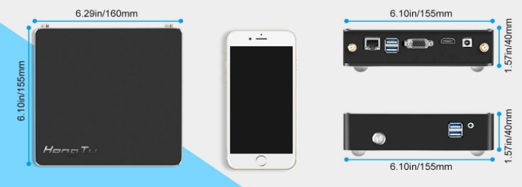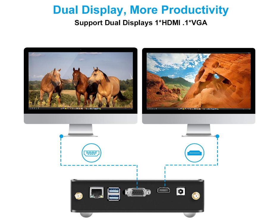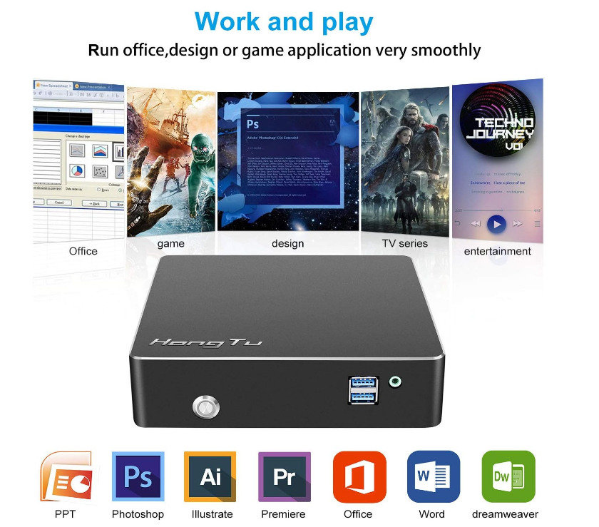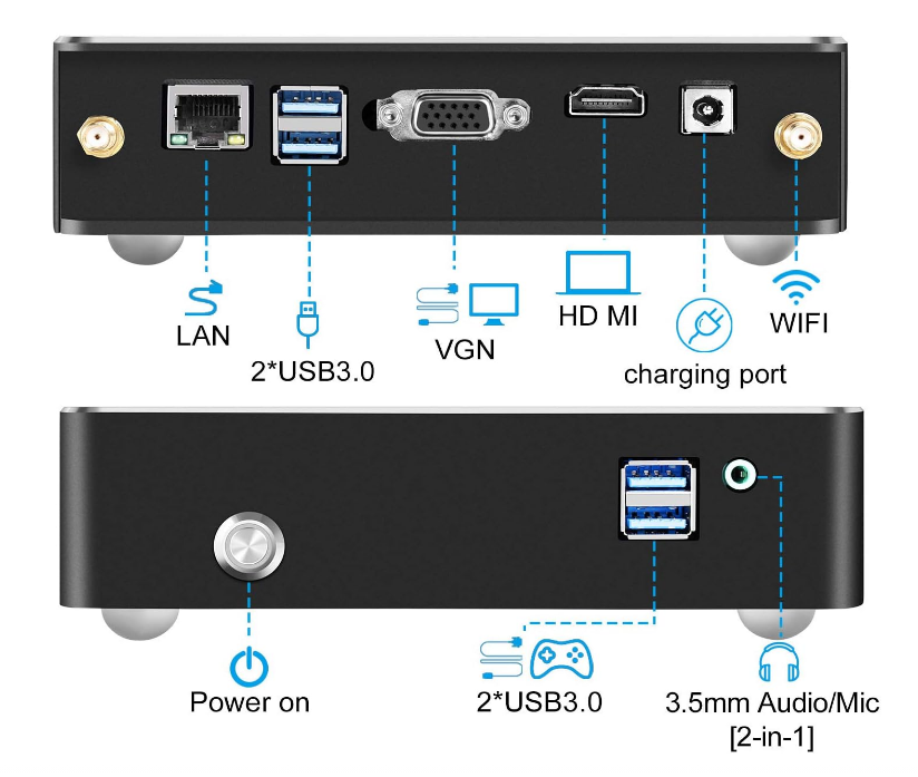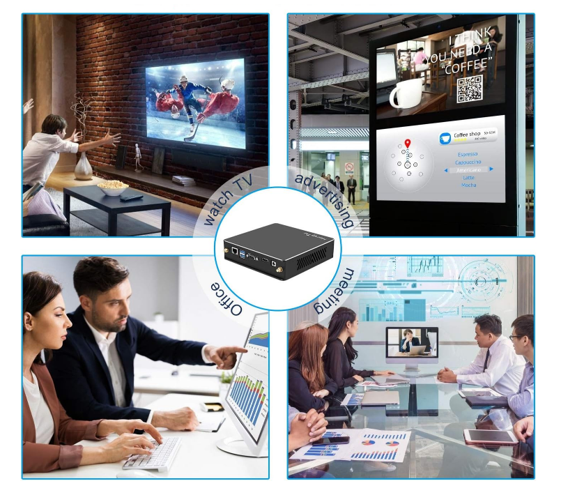 Dankzij het compacte formaat kan de mini-pc eenvoudig op een bureau, achter een monitor, onder een balie of in een media-opstelling worden geplaatst. Het systeem werkt stil en energiezuinig, waardoor het geschikt is voor langdurig dagelijks gebruik.